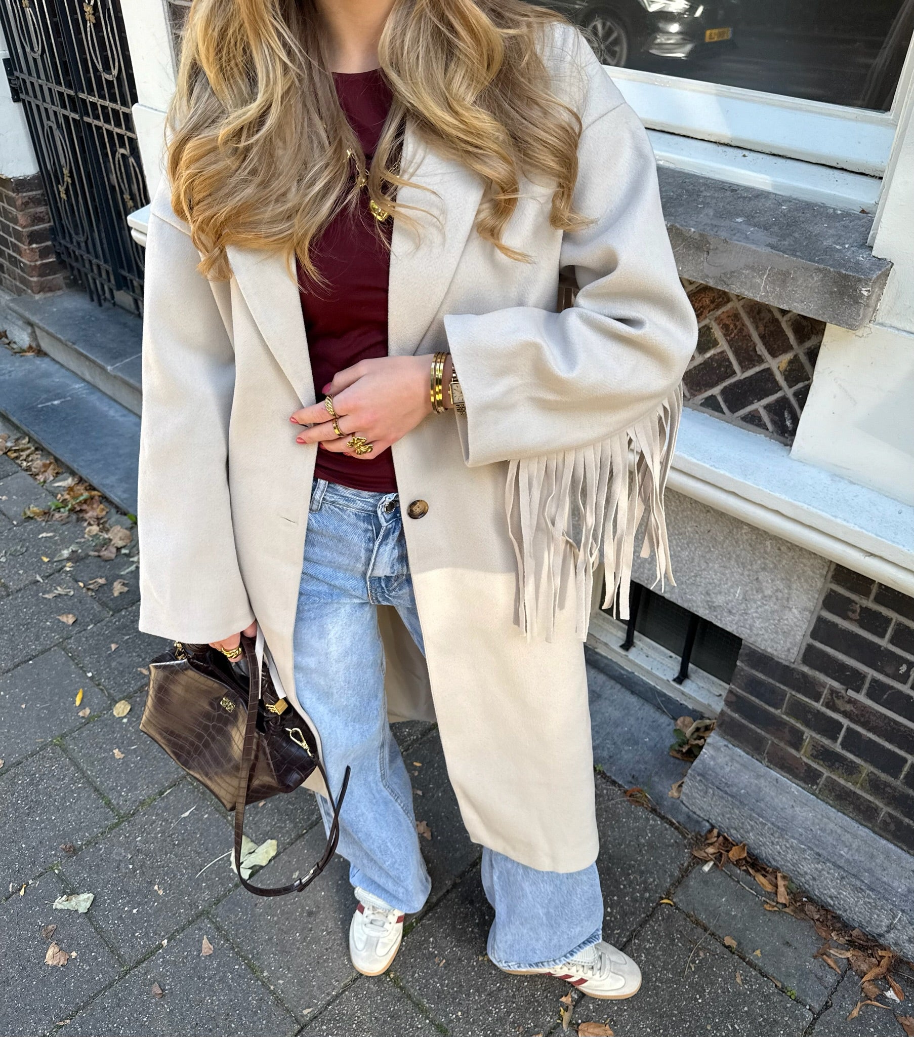 Supergave gevoerde trenchcoat met ruffles op de achterkant en mouwen! Maat One Size en kan worden gedragen vanaf maat XS t/m een kleine XL.