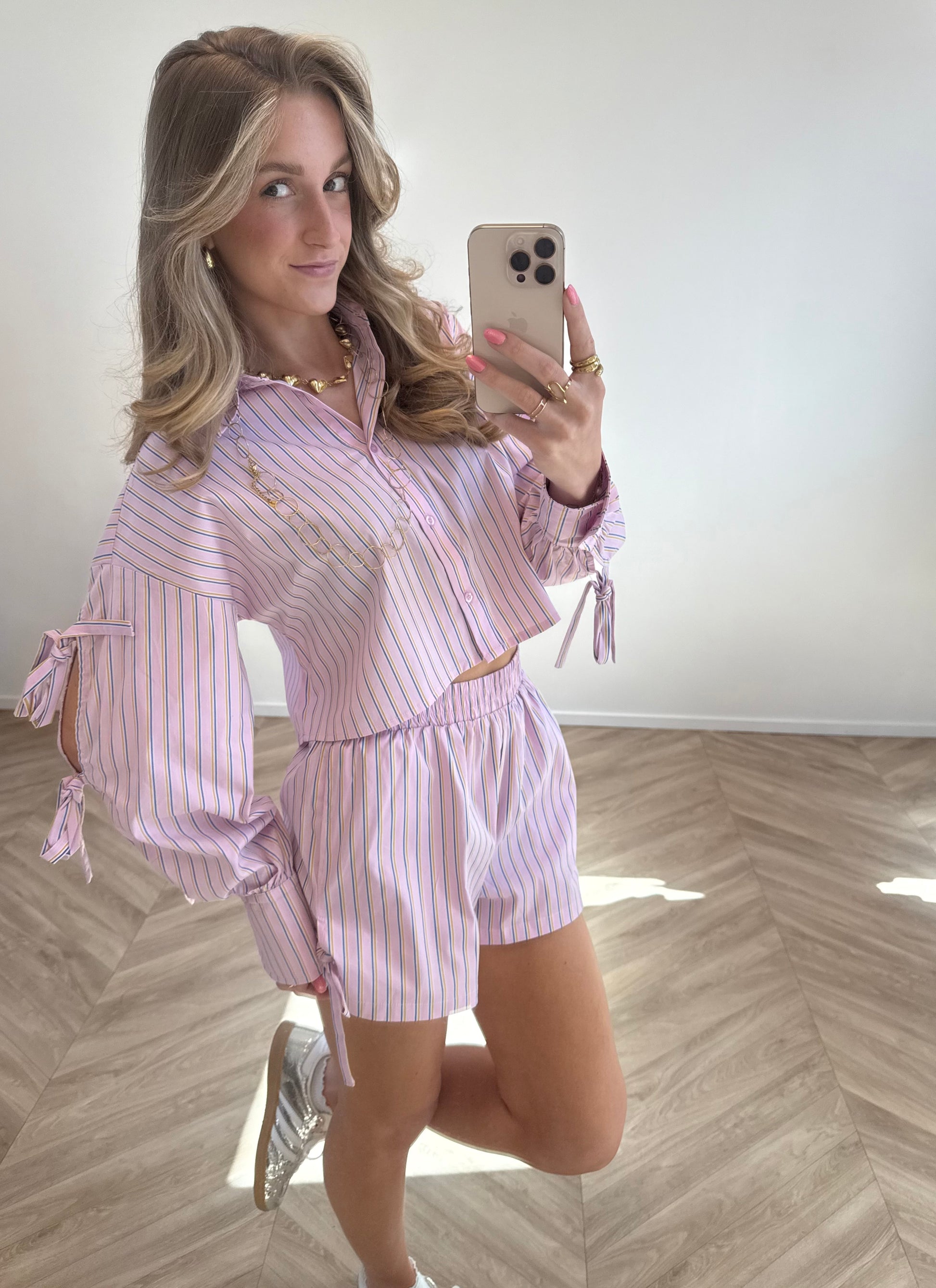 Superleuke set met strikjesdetails wat bestaat uit een Blouse en een Short. Valt goed op maat!